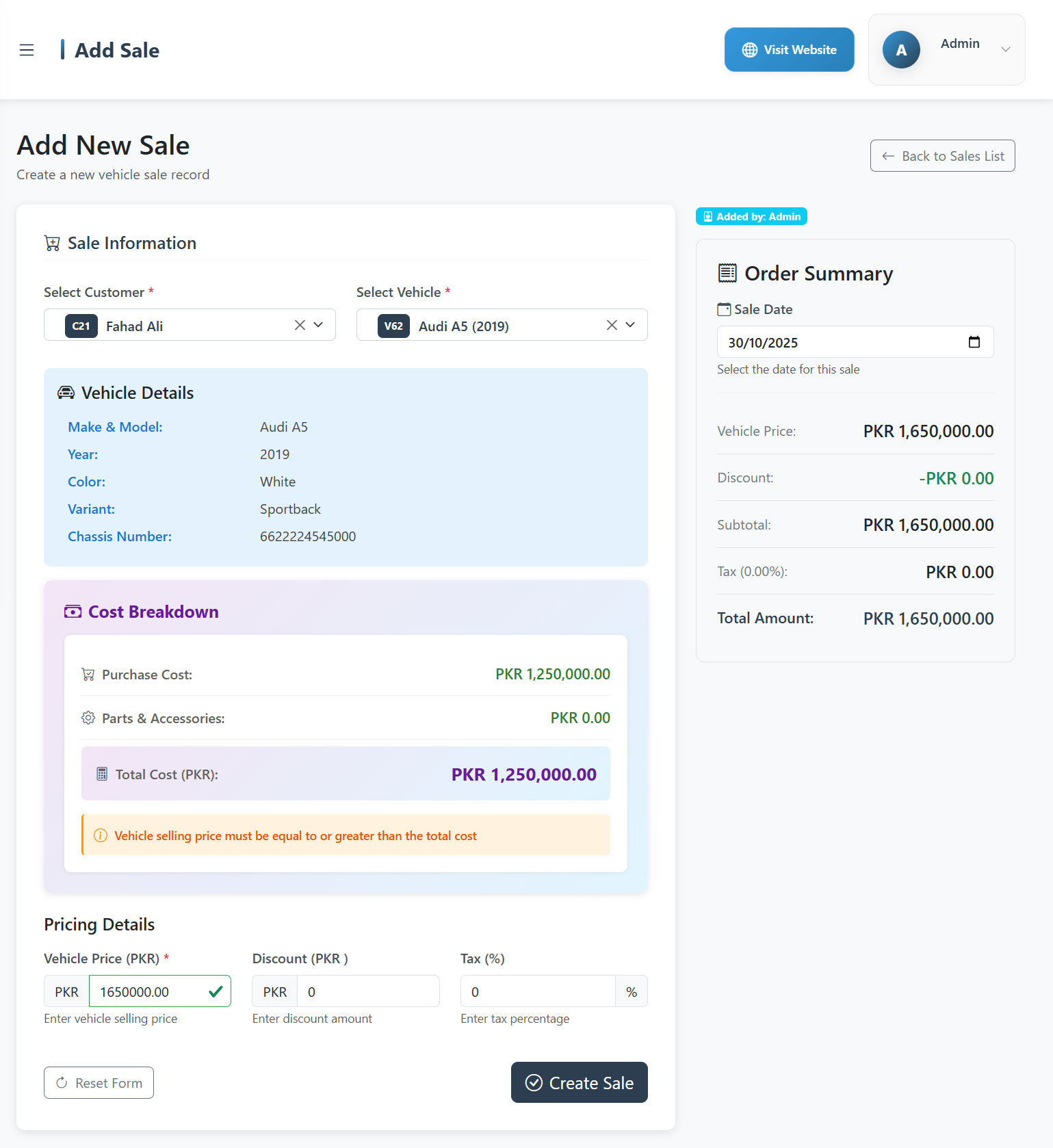 Track any parts or accessories purchased for your vehicles before sale. These costs automatically merge into the total vehicle cost, helping you maintain accurate profit margins.
