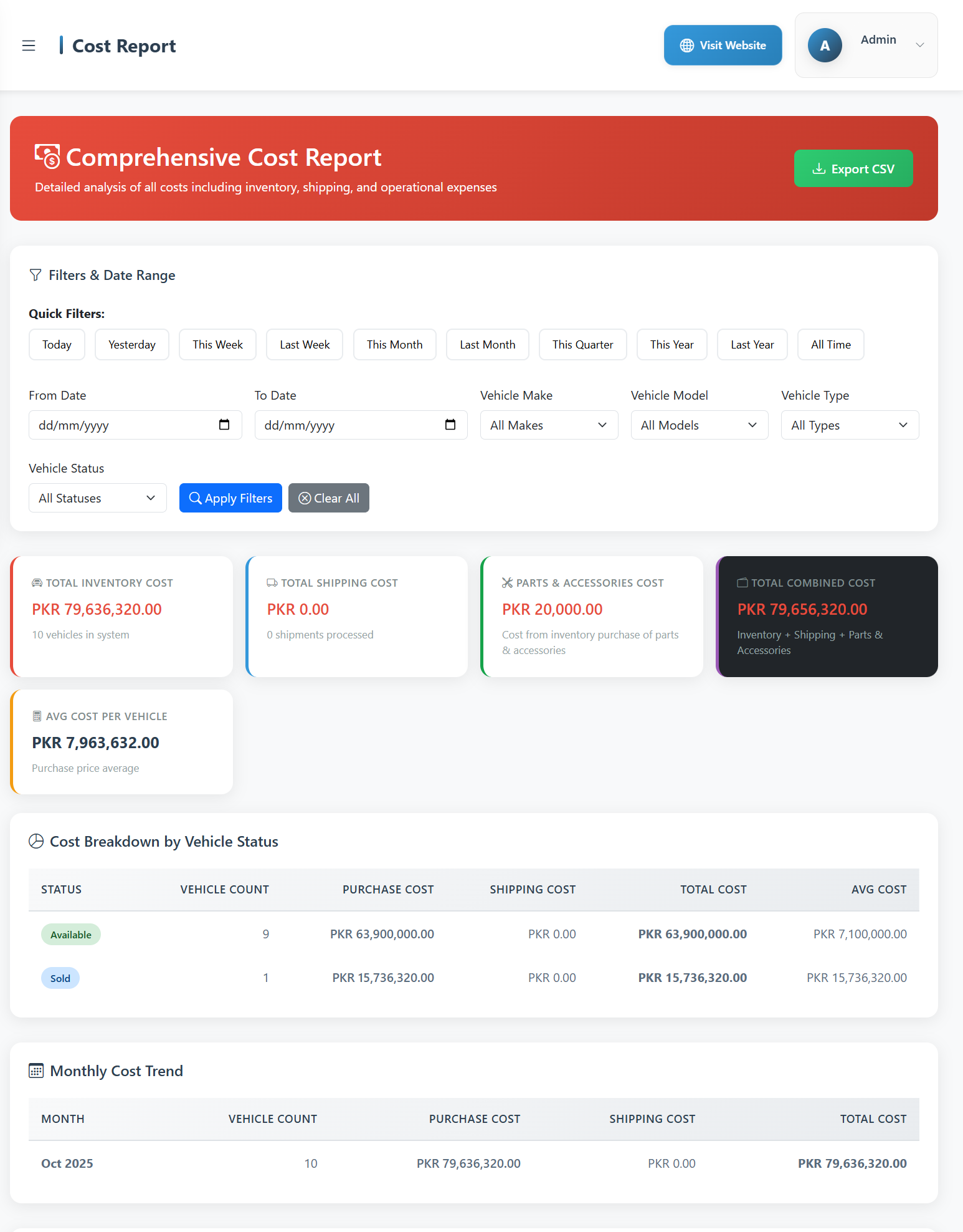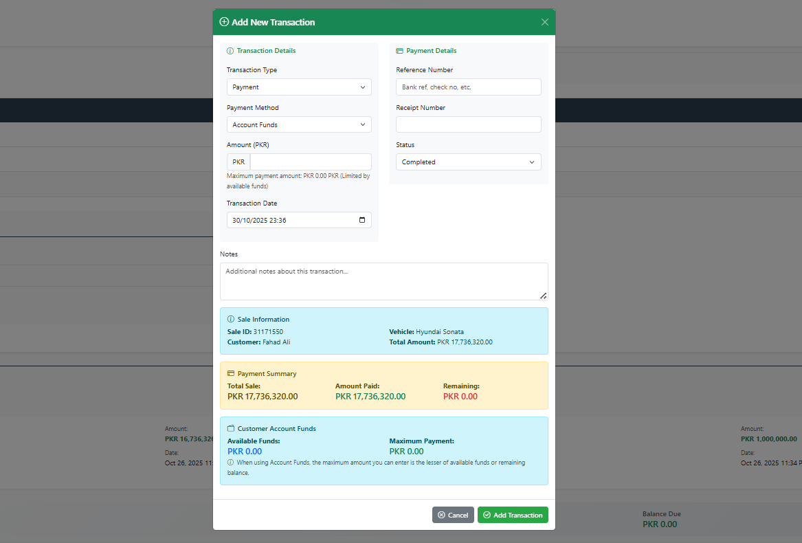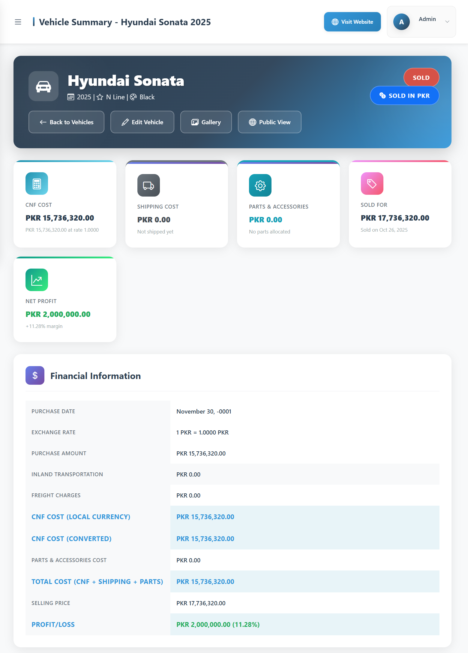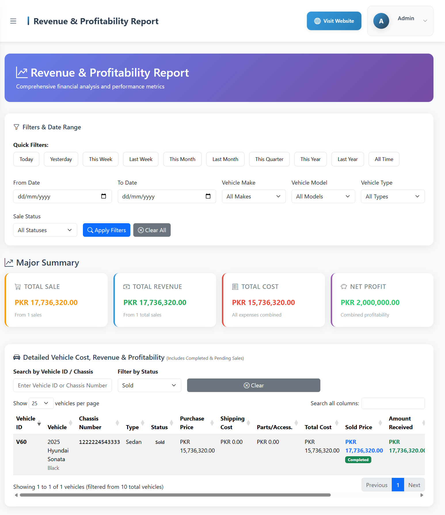Easily manage your entire vehicle inventory — from purchasing to sale. Store details like make, model, color, engine number, purchase price, and selling price. Each vehicle is linked with all related costs, ensuring transparent profit tracking.