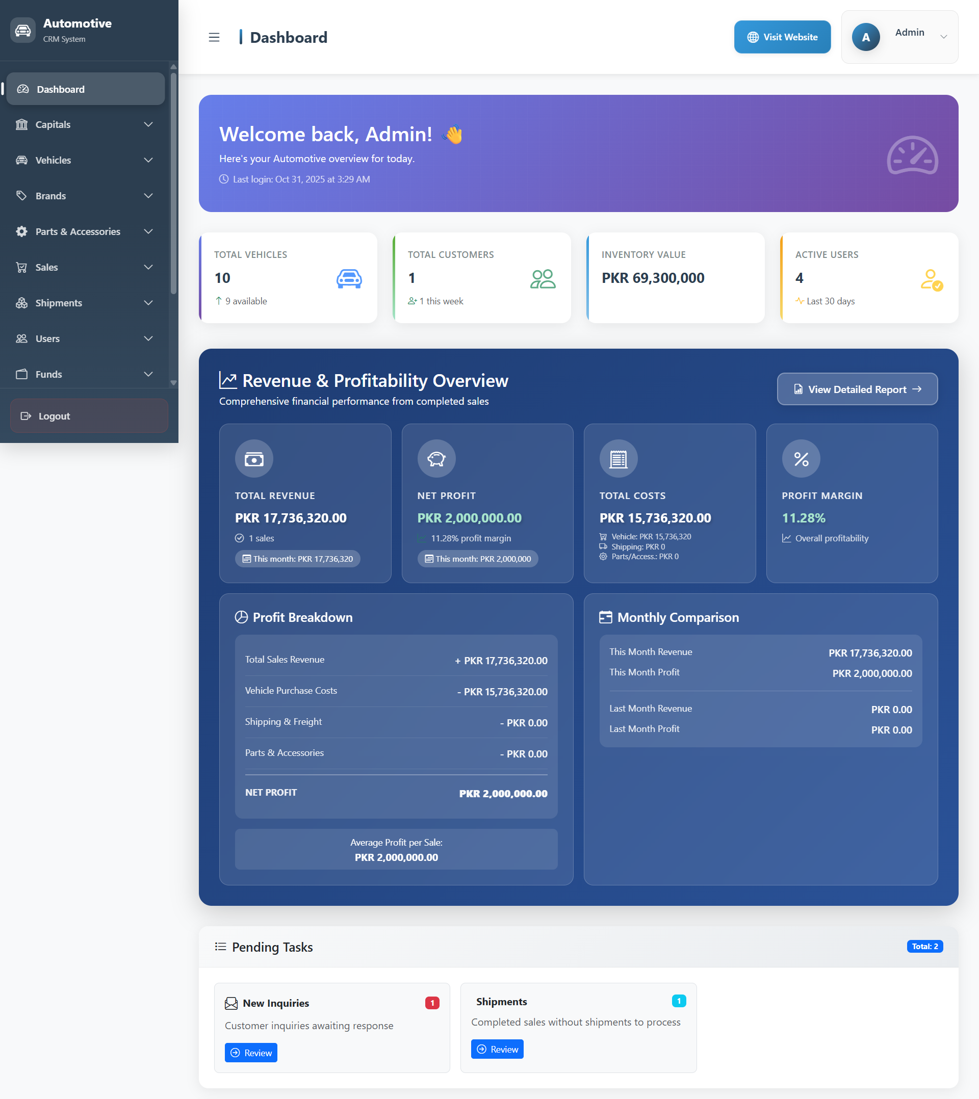 Get a complete system overview at a glance — including revenue, profitability, total vehicles, active customers, pending balances, and more. Visual analytics make it easy to track your financial and operational performance in real time.