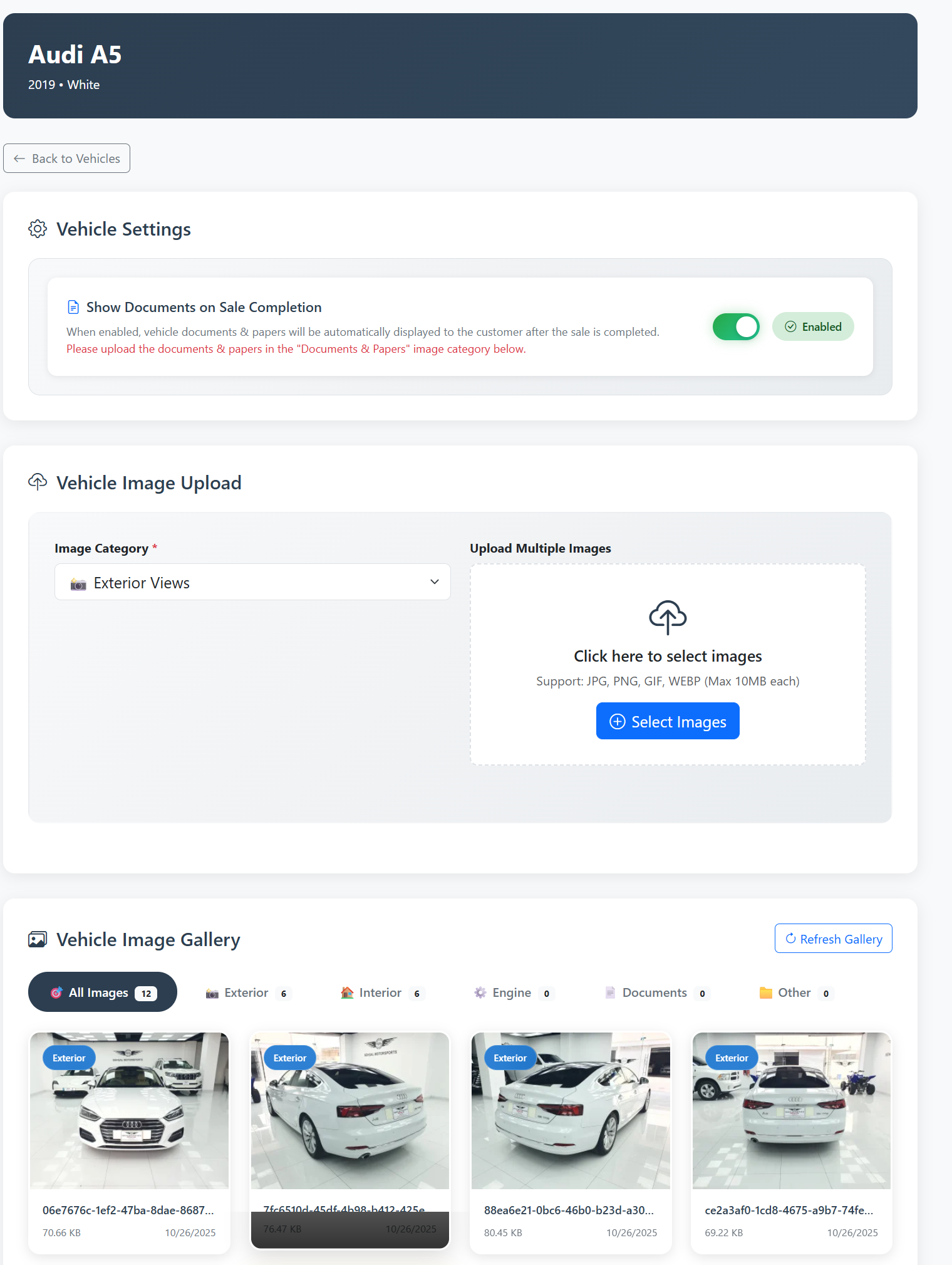 Upload and display high-quality images of your vehicles with multiple photo support. Make your listings more attractive and engaging for buyers.