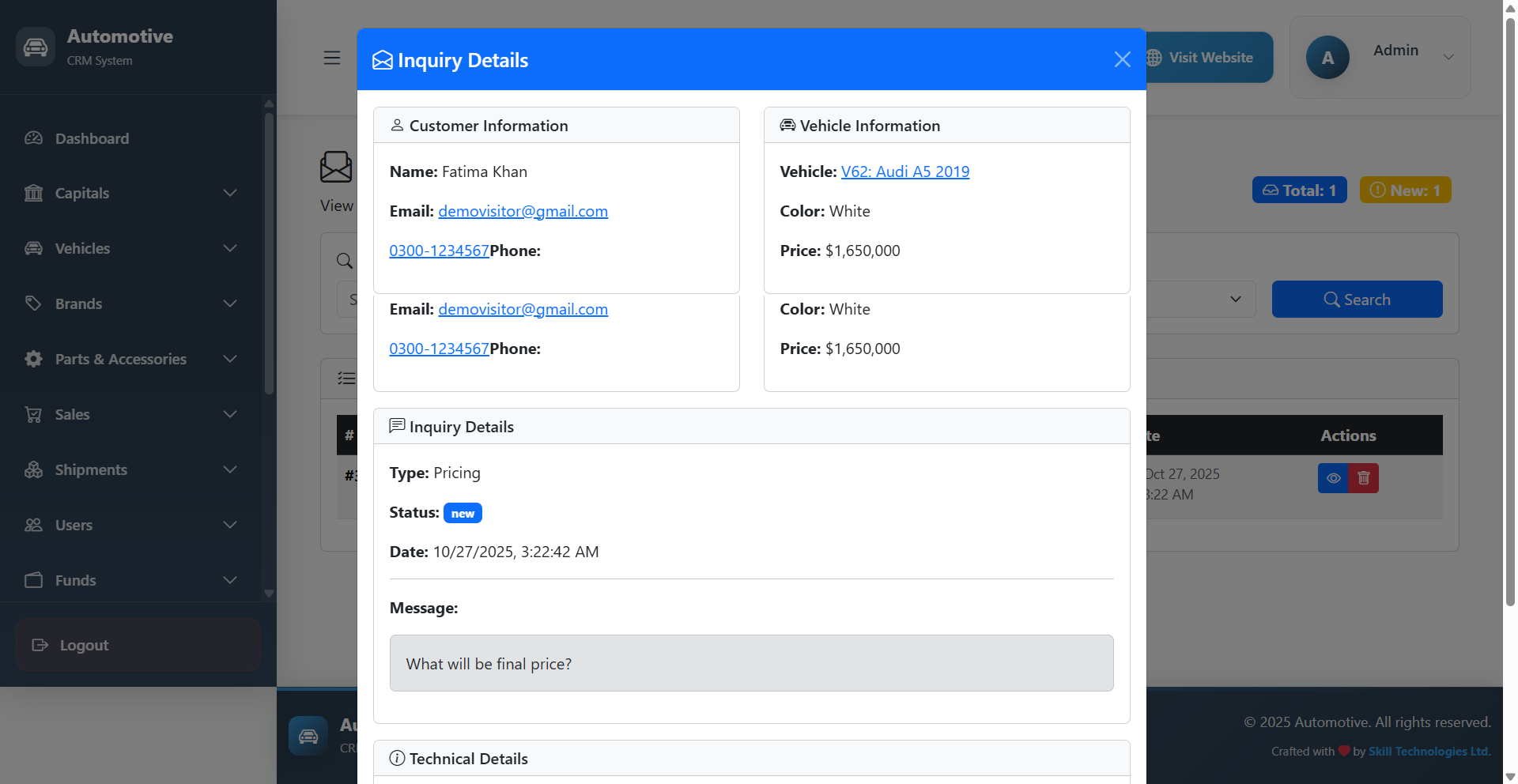 Manage inquiries from potential buyers directly from the frontend website. Assign leads to staff, follow up efficiently, and convert inquiries into successful sales.